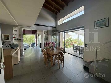 Progettata su un unico livello per offrire il massimo comfort, la villa è composta da un ampio e luminoso salone con soffitti in travi a vista e grandi vetrate che si aprono su uno scenografico terrazzo affacciato sui paesaggi collinari. Completano il piano una cucina abitabile, due camere da letto e un bagno.