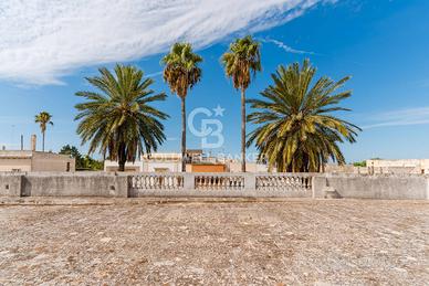Percorrendo uno dei due corridoi, si trova la spaziosa scala in pietra leccese, che porta alla grande terrazza, sovrastata dalla maestosità e dall'eleganza delle palme secolari, che affaccia sul giardino anteriore e su tutta Sogliano Cavour, ariosa come se ne trovano solo nelle residenze d'epoca.