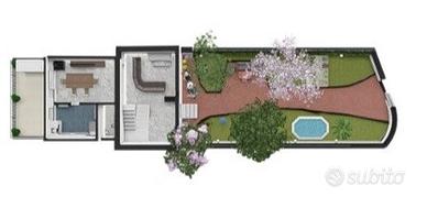 Due camere da letto con balcone affacciato sul giardino, un bagno, ampio terrazzo con veranda coperta, ideale per una seconda cucina, relax o momenti conviviali all'aperto