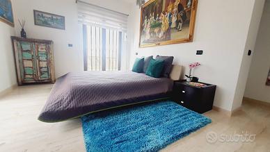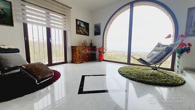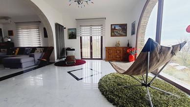 ingresso su cucina ad isola al centro, sala da pranzo e soggiorno il tutto in un unico ambiente open-space, con ampie vetrate ad arco, con panorama sulle colline e vista mare, due camere da letto matrimoniali, una con bagno, salone/studio con ingresso indipendente, secondo bagno ad utilizzo della zona giorno. I pavimenti sono in marmo di carrara, rifiniture in travertino, termosifoni in acciaio color grigio, infissi in legno con doppio vetro antisfondamento,