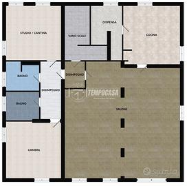 Al piano terra abbiamo ingresso direttamente sul salone di 80Mq da cui si accede alla cucina con relativa dispensa (20,7 + 9 Mq) , tramite un disimpegno possiamo accedere alla cantina (utilizzata come ufficio/studio di 20Mq) ai due bagni del piano terra ( 6 e 5,2 Mq) e alla camera del piano terra (19,9MQ).