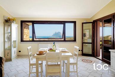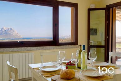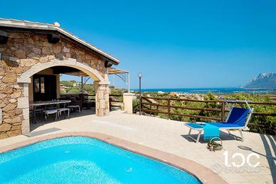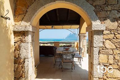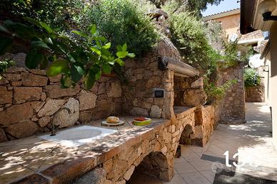 È libero su quattro lati, caratterizzato da materiali che si confondono con la natura come la pietra, il granito, circondato da alberi di olivo e arbusti tipici della macchia mediterranea, l'ampio spazio esterno è suddiviso in diverse aree come la doccia esterna, zona bbq e la graziosa veranda coperta vista mare e Tavolara, internamente è così composto,