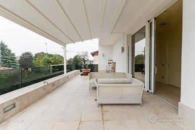 La Fenixgroup presenta con orgoglio questa prestigiosa villa unifamiliare, progettata con grande cura per unire eleganza e sostenibilità. Situata nella tranquilla e ricercata zona di San Fiorano, questa residenza offre un contesto esclusivo a breve distanza dal cuore di Villasanta, dal Parco di Monza e dalle principali vie di comunicazione. La villa si estende su una superficie di 335 mq distribuiti su tre livelli, immersa in un giardino piantumato che la circonda sui quattro lati, regalando privacy e tranquillità. Al piano terra, l'ingresso si apre su uno splendido openspace in cui si integrano una cucina moderna a vista e un'ampia zona living. Le vetrate scorrevoli a tutta altezza lasciano entrare abbondante luce naturale e si affacciano sul giardino retrostante, creando una perfetta continuità tra interno ed esterno. Sempre al piano terra si trova una raffinata camera matrimoniale con accesso diretto al giardino, un angolo di intimità ideale per momenti di relax, completata da un bagno di servizio per maggiore praticità.Una scala dal design elegante conduce al primo piano, interamente dedicato alla zona notte. Le due ampie camere da letto, pensate per il massimo comfort, godono di una luminosità naturale grazie alle grandi finestre orizzontali che regalano una piacevole sensazione di apertura e panorami esclusivi. Il bagno padronale, caratterizzato da finiture di alta qualità e un ampio box doccia, offre un'atmosfera simile a quella di una spa. Un generoso terrazzo circonda tre lati della villa, uno spazio ideale per rilassarsi all'aperto, con una vista che abbraccia l'orizzonte. Ogni ambiente della zona notte è rifinito con materiali di pregio, come il parquet in rovere e dettagli in stucco veneziano, che donano calore e un tocco di raffinatezza all'intero piano. Inoltre, un ascensore monta-carichi collega agevolmente tutti i livelli, aggiungendo ulteriore comfort e praticità.Il piano interrato è stato concepito come un ambiente per il tempo libero e l'accoglien