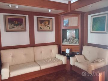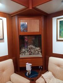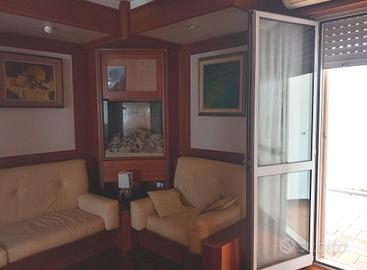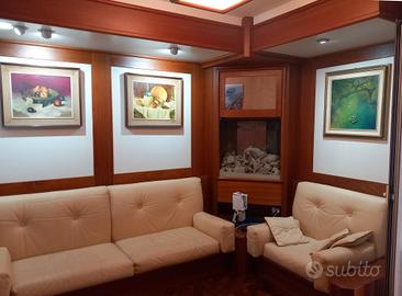 ll suo interno tutto è su misura, tutto è in legno pregiato, lavorato da maestri artigiani, come una cabina di lusso di una nave, accogliente e calda, con punti luce ad effetto. I pavimenti, in legno, perfetti, sono in teak, materiale pregiato e duraturo, resistente, ad alto contenuto di oli naturali, che li rende bellissimi. In abbondanza è stato utilizzato il corian, materiale durevole, facile da pulire, lavorato qui per ottenere il prestigioso ed originale piano cottura, il lavabo nei bagni, la vasca da bagno. Anche nel salotto-studio, al pianoterra, tutto è su misura: la libreria, e i due divani, e tra essi un particolare acquario, che illuminato darà un sicuro tocco d'eleganza.