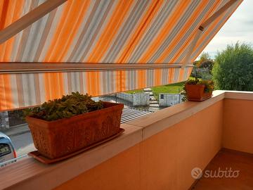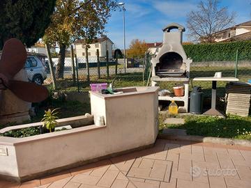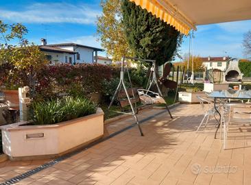 La zona giorno è composta quindi da ben tre ambienti separati e comunque aperti l'uno sull'altro: la cucina abitabile, una sala da pranzo /soggiorno, il salotto. A completamento della zona giorno una dispensa cui si accede anche dall'esterno, ed una lavanderia, spaziosa e finestrata. All'esterno un'area arredabile, con una tenda da sole motorizzata, accessibile dal salotto o dalla cucina, con punto acqua e grill esterni.