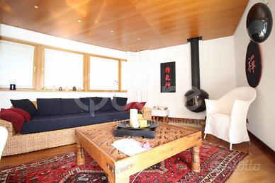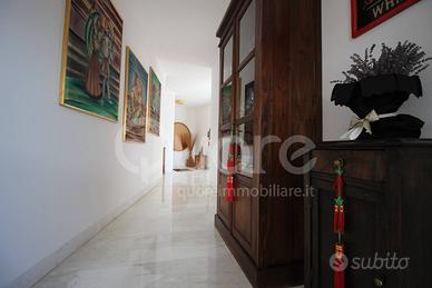 Il piano terra è composto dall'ingresso nell'ampio salone con il caminetto e su cui si affaccia il soppalco, il soggiorno che si collega all'esterno con un lastricato di 50 mq, la cucina abitabile con terrazzo di circa 20 mq, un bagno, una stanza ad uso libreria/studio e una camera ora adibita ad home theatre. Al primo piano la zona notte è composta da tre camere, due bagni, una stanza guardaroba ed il soppalco.