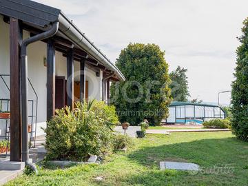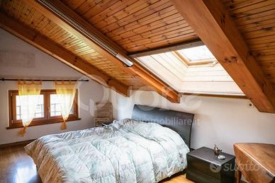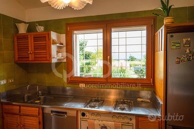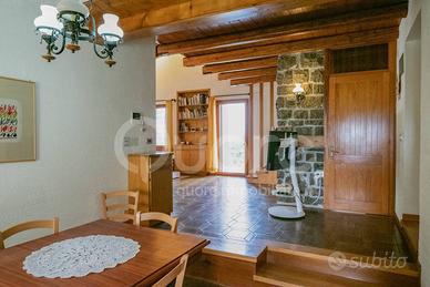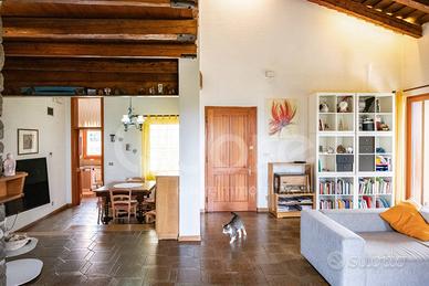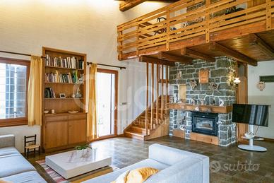 Al piano terra, l'ingresso accoglie in un'ampia sala con un suggestivo caminetto a legna centrale, travi a vista e soppalco. La sala da pranzo e la cucina, con accesso alla veranda, sono perfette per conviviali momenti in famiglia. Il disimpegno conduce alla zona notte, che comprende due camere matrimoniali e due bagni. All'esterno, due deliziosi portici invitano a rilassarsi all'aria aperta.