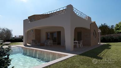 Lussuosa villa con piscina. Vista Mare Elegante e raffinata villa con piscina e vista mare Cod. 147 San Teodoro Località Suaredda La residenza LE VILLE SUARE' è ubicata a San Teodoro (SS), in loc. Suaredda di Supra, una splendida borgata alla periferia del centro abitato, che gode di una splendida vista sul mare, sullo stagno e sull'Isola di Tavolara, a diretto contatto con la natura e il verde rigoglioso circostante. Queste ville singole di nuova costruzione rappresentano la scelta ideale per chi cerca una casa esclusiva, moderna e con tutti i comfort. Situata in un contesto tranquillo e residenziale, la proprietà si sviluppa su due livelli e offre spazi ampi e luminosi. La location dista circa 2 km dalla rinomata spiaggia della CINTA, 2 km dal centro cittadino, inoltre a circa 20 km è possibile raggiungere l'Aeroporto e Porto di Olbia e circa 25 km per la Costa Smeralda. Sull'area in oggetto, è prevista la realizzazione di 3 ville esclusive, tutte con box auto doppio di 30 mq, con superficie commerciale di oltre 200 mq ciascuna, in fase di realizzazione, complete di piscina interrata, rifiniture di alcune pareti in pietra granitica tipo giallo San Giacomo/Ovodda, recinzione del bordo lotto con pietra granitica locale, pavimenti effetto pietra naturale chiara, interazione domotica sui principali elementi della Villa, e altre finiture Luxury rispetto agli standard della zona. Caratteristiche principali: - Tre camere da letto matrimoniali, molto spaziose , ideali per tutta la famiglia, con ampie finestre vetrate che garantiscono luminosità naturale. - Tre bagni di design, dotati di finiture moderne e funzionali, tutti finestrati. - Un'ampia zona giorno che si affaccia sulla veranda e piscina , perfetta per momenti di relax e per accogliere gli ospiti in un ambiente confortevole e raffinato. - Veranda e terrazza panoramica con vista mozzafiato sul mare, sullo stagno e sull'affascinante isola di Tavolara, ideali per godersi una splendida alba al sorgere del sole sull'o