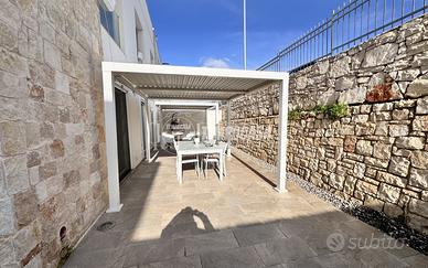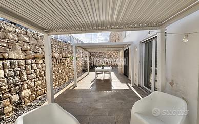 La villa accoglie con un terrazzo a livello che circonda l'intera abitazione, uno spazio prezioso da vivere ogni giorno, ideale per momenti di relax o pranzi all'aperto. Varcando la porta d'ingresso al piano rialzato, si viene accolti da un luminoso soggiorno con cucina a vista, un bagno e una camera perfetta come studio o stanza per gli ospiti.