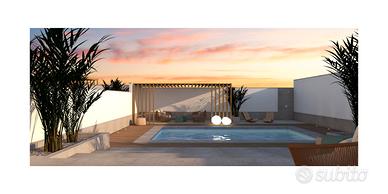 All'esterno, ampi giardini privati da 180 a 275 mq con area verde, parcheggio interno e piscina esclusiva in cemento armato (4x7 m), perfetta per momenti di relax e convivialità.