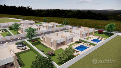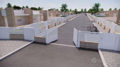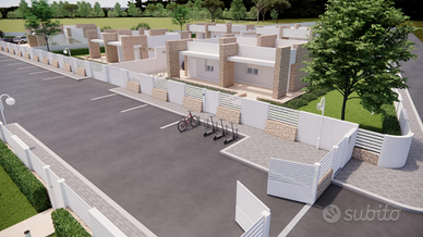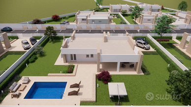 Le ville di 105 mq, circondate da 1000 mq di giardino su tutti i lati, sono composte da ampio ingresso/soggiorno, cucina a vista, 2 bagni completi, ripostiglio, 3 camere da letto. Completano gli immobili un patio anteriore accessibile dal soggiorno e da due camere da letto, un paio posteriore di 40 mq accessibile dal soggiorno e dalla camera matrimoniale, l'ampio terrazzo di accessibile da comoda scala esterna in pietra, 2 posti auto all'interno del giardino privato e altri 3 posti auto all'interno del residence. Immobili rifiniti, classe A4, termoautonomi, dotati di caldaia a condensazione, infissi doppio vetro/PVC taglio termico, impianto fotovoltaico, climatizzatore zona giorno e un climatizzatore per ogni camera da letto, pavimento in gres porcellanato, porta blindata. Possibilità di personalizzare interamente la villa e possibilità di richiedere la realizzazione di una piscina. ACQUISTANDO QUESTE NUOVE VILLE POTRETE ACCEDERE A DETRAZIONI FISCALI PARI A 50.000 ? Contesto riservato e tranquillo, residence servito dalla rete idrico/fognaria, elettrica Vicinanza strategica ai principali servizi pubblici come scuole, fermata bus, market. Gli immobili saranno ultimati entro Dicembre 2025. Superficie: - Abitazione: 105 mq - Giardino: 1000 mq