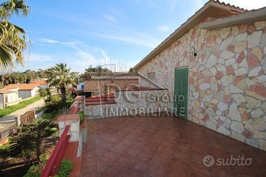 La villa esternamente dispone di ampi spazi, con due verande di cui una coperta,doccia esterna e posti auto, circondata da vegetazione di alberi, piante di vario tipo e giardino, il tutto ben curato. - Maggiori Dettagli: Veranda avanti casa, Piano terra, Barbecue, Vista mare, Vista mare, Terreno pertinente, TV, Balconi