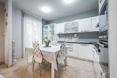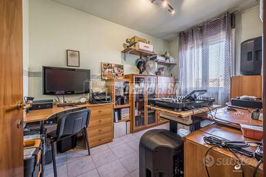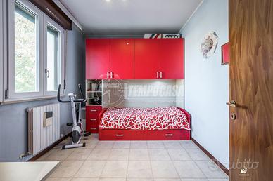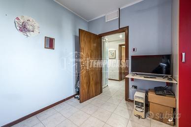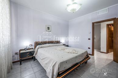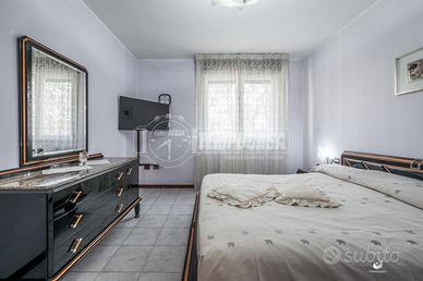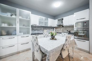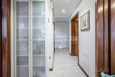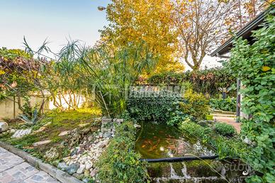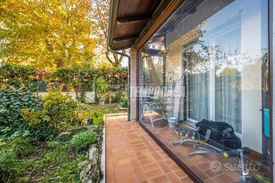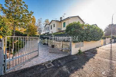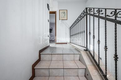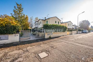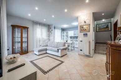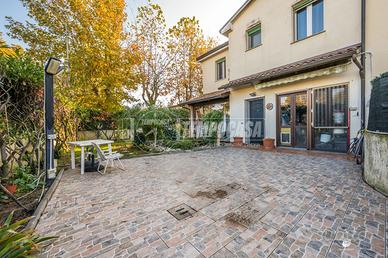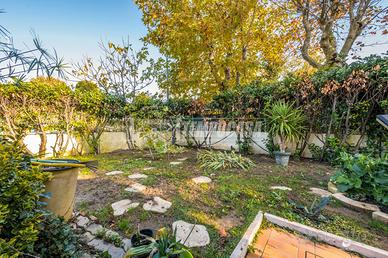 Trattasi di Porzione di casa con Giardino privato su due lati ad angolo. Internamente, disposta su due livelli, troviamo: ingresso al piano terra (2,1 Mq), Soggiorno (18,7 Mq), Cucina a vista (10,4 Mq), Vano sottoscala; dalla scala si accede al piano primo composto da Disimpegno (7 mq), Camera Matrimoniale (14,1 Mq), due Camere singole ( rispettivamente 9,2 Mq e 9 Mq), Bagno (4,2 Mq), Cabina armadio (4,3 Mq). Completano la proprietà il Giardino Privato, Portico d'ingresso ed Autorimessa al piano terra.