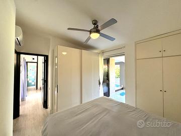 VILLASIMIUS - A soli 250 metri dalla splendida baia di 'Campulongu', in contesto condominiale immerso nel verde curato e dotato di piscina, villetta a schiera con ampio giardino privato e vista mare.