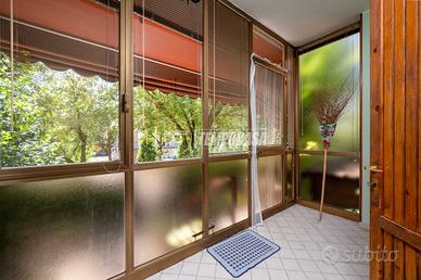 La soluzione è così composta: Tramite il giardinetto privato si accede ad una scala esterna che conduce ad una veranda chiusa da vetrate.