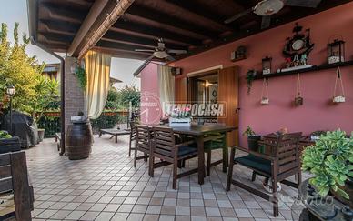 Tempocasa Montichiari propone in vendita in zona residenziale tranquilla e ben servita, una villetta a schiera di testa di 207 mq dal carattere riservato e accogliente, ideale per chi cerca spazi generosi, indipendenza e comfort abitativo. Libera su tre lati e distribuita su tre livelli, l'abitazione si distingue per l'ottima esposizione, la funzionalità degli ambienti e la qualità delle finiture. Al piano terra si apre una luminosa zona giorno in open space, dove cucina e soggiorno convivono in un ambiente ampio e ben organizzato, perfetto per la vita quotidiana e per accogliere ospiti. Sempre al piano terra, troviamo un bagno finestrato e una comoda veranda chiusa sul lato confinante utilizzabile come zona relax. Salendo al primo piano si sviluppa la zona notte, composta da due camere matrimoniali e una camera singola tutte con accesso diretto ai balconi. Completa il piano un secondo bagno finestrato, dotato di doccia. Il piano interrato offre ulteriori spazi molto funzionali: un'ampia taverna, zona lavanderia con caldaia, due cantine e un box doppio in lunghezza di 73 mq, ideale anche come zona deposito. All'esterno, la proprietà è arricchita da un porticato coperto sul lato, perfetta per pranzi all'aperto o area barbecue e un curato giardino frontale. Costruita nel 2002 e ristrutturata nel 2015, la villetta è dotata di doppi vetri, zanzariere, persiane esterne, riscaldamento tramite stufa a pellet e impianto di condizionamento. Questa soluzione rappresenta un'opportunità ideale per famiglie numerose o per chi cerca spazi comodi, versatili e pronti da vivere, in una delle zone più richieste di Montichiari. Per fissare un sopralluogo contattare: Tempocasa Montichiari - Via F. Cavallotti 5A (BS) - 25018 - tel. - *DEVI FARE MUTUO? TI AIUTIAMO NOI: Le visite saranno organizzate su