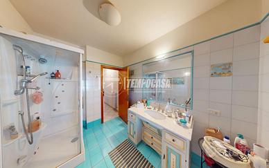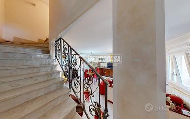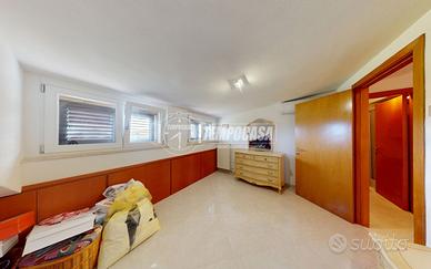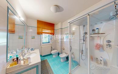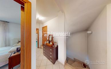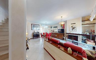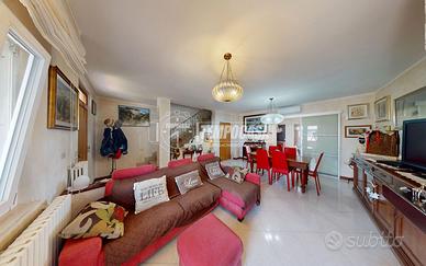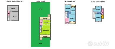 Villetta a schiera di testa quindi libera su 3 lati con corte perimetrale di 220MQ e sviluppata su 4 livelli abitativi, così composti : PIANO TERRA di 56MQ (zona giorno) composto da ingresso su ampio soggiorno, munito di camino ed uscita sul balcone lato ovest di 8MQ collegato alla corte tramite gradini, cucina abitabile divisa da porta scorrevole in vetro con uscita sul balcone lato est di 8MQ collegato alla corte tramite gradini e bagno di servizio finestrato con cabina doccia - 1° PIANO di 60MQ (zona notte) composto da camera matrimoniale con uscita sul balcone lato ovest di 4MQ, camera doppia, camera singola anche utilizzabile come cabina armadio con uscita sul balcone lato est di 3MQ e bagno finestrato con cabina doccia multifunzione e idromassaggio - 2° PIANO mansardato di 41MQ diviso in due stanze pluriuso da poter utilizzare come camere, studio ecc. è presente anche qui un bagno con cabina doccia e la parte piu' bassa è dotata di ripostigli. Completano la proprietà una grande cantina adibita a rustico di 21MQ, una lavanderia ed un garage di 20MQ tutto al PIANO SEMINTERRATO. Tutti i piani sono collegati tramite scala interna privata. La soluzione dispone anche di un posto auto privato recintato, con accesso tramite cancello elettrico, sito al piano strada.