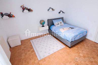armadiatura su misura e TV a parete. Completa l'ambiente un bagno finestrato con box doccia.