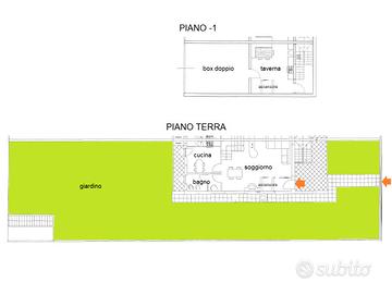 Al piano terra è composta da soggiorno con doppia esposizione, cucina abitabile e un bagno. All'esterno due portici e 239 mq di giardino privato, che gira sui 3 lati della casa.