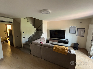 Vendo villetta a schiera completamente arredata a nuovo, classe energetica A4 dotata di tutti i comfort, impianto fotovoltaico, pompa di calore, colonnina di ricarica auto, condizionatori in tutte le stanze, videocitofoni, tende da sole motorizzate. Bassissimi consumi e spese di gestione (no condominio), composta da piano seminterrato taverna e garage, piano terra soggiorno cucina bagno e ripostiglio, piano primo tre camere bagno e ripostiglio. Completa il tutto piccolo giardino con patio e posto auto. Primo contatto via mail, solo privati.