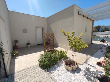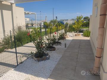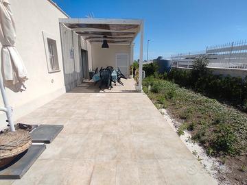 Vendesi bellissima villetta a schiera completamente arredata di circa 70m² su un lotto di 500m² in una delle zone più esclusive di Augusta nel complesso residenziale I Giardini di Brucoli, con una spesa condominiale irrisoria di 1€ al giorno, ovvero 365€ l'anno, il complesso è recintato ed accessibile solo dai residenti attraversando il cancello automatico, composta da: Ingresso su ampio soggiorno-cucina con accesso alla grande veranda attrezzata coperta da pergolato, ampia camera da letto, ampia cameretta e bagno con doccia e lavabiancheria. La villa è di recente costruzione, anno 2022, ed è conforme alle ultime normative antisismiche ed energetiche in Classe A4, impianto fotovoltaico per la corrente elettrica, gode di ottime finiture di pregio dagli infissi a triplo taglio termico alle porte in legno, la porta d'ingresso blindata ed il sistema d'allarme, completano la proprietà giardino con piante ornamentali e fioriere (in fase di ultimazione) con impianto d'irrigazione automatizzato e posto auto dal quale si accede dal cancello carraio. Gli ambienti sono climatizzati