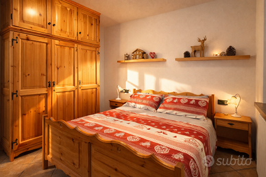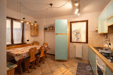 In zona residenziale, sempre soleggiata, vicina agli impianti di risalita facilmente raggiungibili con servizio di skibus, affittasi ampio bilocale al piano terra in graziosa villetta con terrazzo e giardino. Cucina abitabile, soggiorno con divano letto matrimoniale e letto a castello, camera matrimoniale e bagno con lavatrice. Grande autorimessa. (unica unità immobiliare presente).