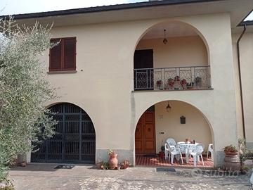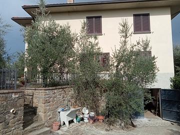 Villetta singola Bifamiliare con ampio resede olivato completamente recintato di Mq. 2.500, servita da 2 accessi su strade e posta in ottima posizione collinare - panoramica - soleggiata, servita di comoda viabilità e prossima ai servizi del paese . Il fabbricato è disposto su 3 piani per complessivi Mq. 330 circa, e così distribuiti : P.Semint.; Garage, Cantine, locale Caldaia, e Vano scale. Piano Terra; Portico, Ingresso/Disimpegno, Cucina, Camera, Taverna/Cantina, Sgombero e Bagno. Piano Primo; Disimpegno, Loggiato, Cucina con Terrazza, Soggiorno, 3 Camere e Bagno. L'immobile si trova in ottime condizioni strutturali, protetto nelle mura portanti da adeguata intercapedine percorribile, le rifiniture ed servizi igienici con gli impianti sono da aggiornare. Il contesto paesaggistico circostante è molto gradevole, essendo in aperta campagna. Rif. 032 Richiesta Euro 365.000 . X Info Paolo 360 977978