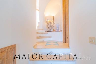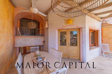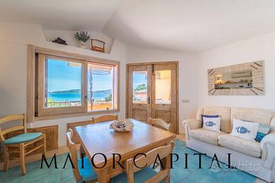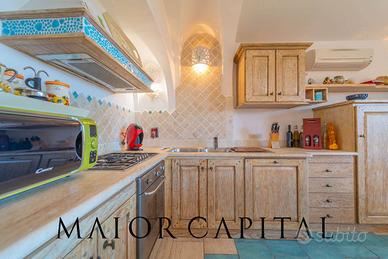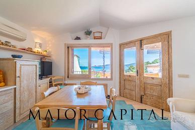 La proprietà si sviluppa su due piani separati tra loro. Il piano principale con ambienti separati da eleganti gradini che ne valorizzano la disposizione, si distingue per la veranda coperta con travi a vista, che offre ombra e freschezza nelle giornate estive, affacciandosi sul golfo e regalando un panorama suggestivo che arriva fino all'orizzonte marino. Questa vista può essere goduta anche dal luminoso soggiorno in stile mediterraneo con cucina a vista. Un pratico bagno di servizio situato su un livello leggermente rialzato completa il piano principale.