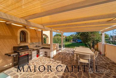 Lingresso alla proprietà avviene tramite un giardino privato che abbraccia due lati della casa, offrendo ampi spazi esterni ideali per momenti di convivialità e vita allaperto. La veranda coperta allingresso si presta perfettamente per pranzi e cene in compagnia, protetti dal sole.