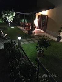Il giardino, ampio e curato, è valorizzato da illuminazione dedicata e impianto di irrigazione automatica, con la presenza di alberi secolari di alto fusto e siepi perimetrali che assicurano riservatezza e continuità con il paesaggio naturale.