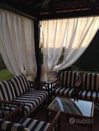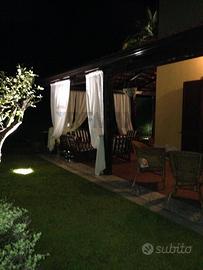 Gli spazi esterni costituiscono uno degli elementi di maggiore pregio: due grandi patio, per complessivi 120 mq, uno interamente in muratura e laltro con copertura in cotto, consentono una piena vivibilità allaperto in ogni momento della giornata. Completano la dotazione un terrazzino panoramico, una zona con doccia e spogliatoio e unulteriore struttura coperta di servizio.
