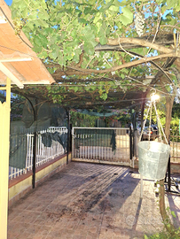 con giardino pavimentato su due lati, patio coperto, 3 camere da letto, due bagni, salone angolo cottura, ripostiglio esterno, Pergola con uva.