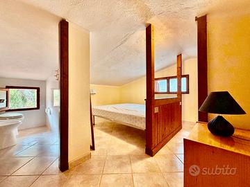 A completare questo livello una camera da letto con affaccio sul loggiato retrostante, dotato di zona lavanderia e doccia esterna. Tramite una comoda scala in legno, si raggiunge il piano soppalcato dove trovano spazio due ambienti entrambi finestrati adibiti a camera da letto e bagno.