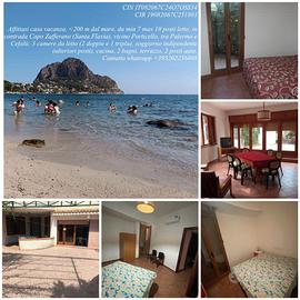 Affittasi casa vacanza, a meno di 200 m dal mare, da min 7 a max 10 posti letto, in contrada Capo Zafferano (Santa Flavia), a 2 km da Porticello, tra Palermo e Cefalù, composta da 3 camere da letto (2 doppie e una tripla), ampio soggiorno indipendente con ulteriori posti letto, cucina, 2 doppi servizi (doccia esterna), ampio terrazzo esterno parzialmente coperto, 2 posti auto riservati.