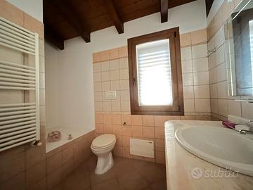 La zona notte, situata al primo piano e collegata da una raffinata scala con corrimano in ferro battuto, ospita tre comode camere da letto e un secondo bagno. Il piano superiore è valorizzato da un solaio rifinito con travi in legno a vista, che conferiscono charme e personalità agli ambienti.