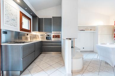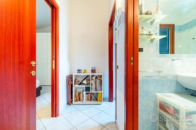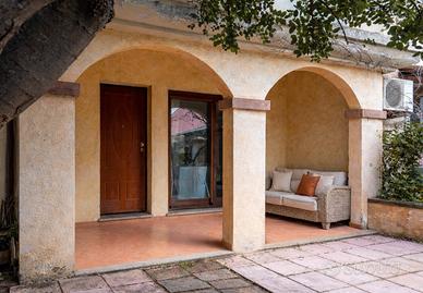 L'accesso all'abitazione avviene tramite una veranda coperta, dalla quale si entra sia attraverso portoncino blindato affiancato a una porta finestra, che garantisce luce naturale alla zona giorno tramite la veranda stessa.