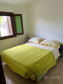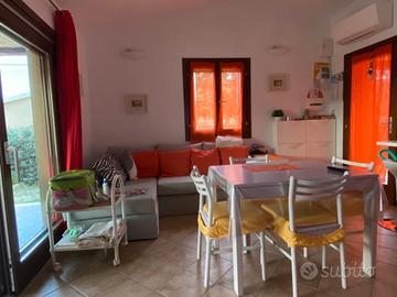 L'immobile è inserito in un complesso residenziale con spazi verdi in comune, cortile con due parcheggi per ogni unità immobiliare protetti da una sbarra elettronica riservata ai proprietari, in zona molto tranquilla anche nei periodi di maggior afflusso turistico. L'unità immobiliare si sviluppa su un solo piano, senza nessuno al piano superiore, ed è così composto: 2 camere da letto, soggiorno con cucina, bagno e veranda, e' inoltre dotato di zanzariere su tutte le finestre e pompa di calore in tutti i locali. L'immobile è completamente arredato e corredato con giardino di proprietà di 200 mq. sui tre lati delimitata da siepi e un ulivo secolare. Piscina condominiale a disposizione di 7 proprietari. La proprietà dispone inoltre di: impianto fotovoltaico, cisterna di acqua da 4000 litri provenienti dal pozzo di proprietà ed eventuale collegamento ad Abbanoa, telecamere di sorveglianza sui tre lati della casa, progetto approvato per un eventuale secondo bagno; inoltre sono disponibili in giardino due casette per il ricovero degli attrezzi da giardino e/o attrezzatura da spiaggia e varie, oltre a un camino/BBQ con forno per la pizza. Anno di costruzione 2011, Classe energetica C (124KWh/mq.anno) da adeguare per installazione fotovoltaico.