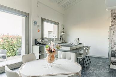 L'ingresso avviene attraverso un elegante loggiato, pensato per accogliere e vivere ogni stagione. All'interno, l'ampio soggiorno open space con cucina a vista e isola in stile americano è inondato di luce naturale grazie alle grandi vetrate, creando un ambiente arioso e accogliente.