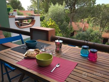 La villetta, curata in ogni dettaglio, offre spazi luminosi e accoglienti, perfetti per chi desidera una casa vacanza o una residenza principale all'insegna del relax e del contatto con la natura. Il giardino privato, circondato da pini secolari, è il luogo ideale per godersi momenti di convivialità all'aperto o per rilassarsi all'ombra, cullati dal suono del mare.