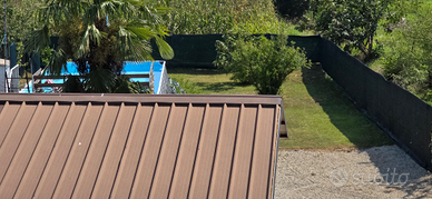 800 metri di giardino e cortile accolgono tettoie dove possono essere rimesse auto e camper.