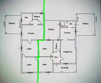 Vendo villa di 210 mq2 di casa , di cui una 130 mq2 una e 80 mq2 l 'altra ,ognuno puo' essere indipendente o unica a piacere delle proprie esigenza utile anche per 2 famiglie perche'compresa di utenze separate(luce ,acqua di pozzo sondato,ect) Intorno circondata da 800 mq2 di prato sintetico e alberi. La casa e'degli anni 70 ,con apportate migliorie di restrutturazioni negli anni , tra cui infissi ,porte pavimenti,bagni e altro . Pronta per abitare.