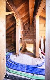 Salendo al primo piano si percepisce subito la calda atmosfera creata dalle travi in legno a vista. Qui sono presenti una camera matrimoniale di ottime dimensioni, un secondo bagno e il locale caldaia già organizzato. Il piano interrato, collegato sia internamente sia attraverso la rampa esterna, offre spazi generosi: un garage triplo comodo per auto, attrezzature e mezzi agricoli, una taverna ideale per creare un ambiente conviviale e una cantina perfetta come deposito o spazio tecnico.