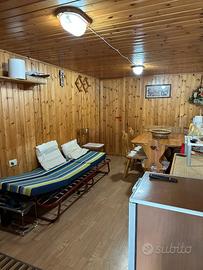 vendesi villetta in legno con roulotte annessa , abitabile da subito con grande roulotte da 4-6 posti letto , bagno con doccia , cucina attrezzata, corte esterna verandata fissa ..con barbecue in pietra.. massetto in cemento e tavolo da pranzo .Riscaldamento autonomo con Bombola esterna per inverno.