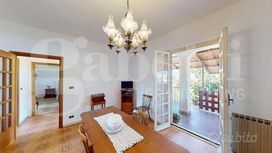(secondo appartamento) Ingresso ampio, grande salone con camino, cucina abitabile con stanza ad uso ripostiglio annessa, tre camere da letto, bagno, ripostiglio e terrazzo porticato vivibile;