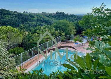 Proponiamo deliziosa villa bifamiliare libera su tre lati, con piscina privata, giardino e vista sulla costa. L'immobile si sviluppa su tre livelli ed è dotato di due ingressi. L'ingresso principale con portoncino blindato ci porta ad un luminoso soggiorno con camino, per godersi le serate invernali, cucina abitabile e bagno di servizio, proseguendo attraverso la scala in marmo si raggiunge il piano superiore dotato di camera matrimoniale con terrazza, camera doppia e bagno con doccia e finestra.