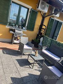 Primo piano soggiorno circa 35 metri quadri +cucina e un bagno giardino davanti,e dietro la casa per un totale di circa 80 metri