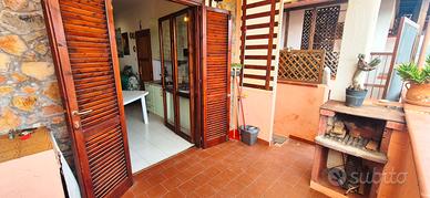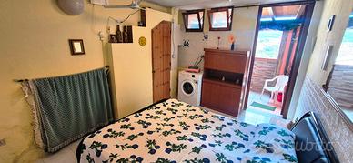 Dalla terrazza d'ingresso si accede inoltre a un ampio vano strutturalmente nato come garage, ma attualmente utilizzato - grazie a una concessione in sanatoria in corso - come monolocale indipendente completo di veranda coperta e bagno. Questo spazio confina e comunica con un ulteriore vano adiacente adibito a cantina abitabile.