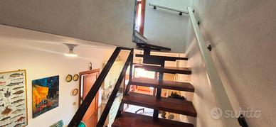 Dal soggiorno, una scala a giorno conduce al piano superiore, dove si sviluppa la zona notte composta da due vani distinti: una camera matrimoniale con terrazzo dedicato e una seconda camera con balconcino privato. Entrambe godono di una vista aperta su Villasimius, regalando luce e respiro agli ambienti.