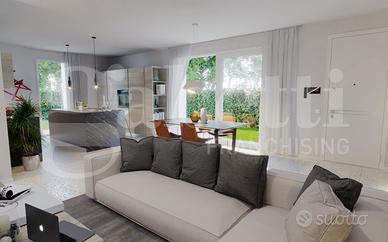 Inserita in un contesto privato, l'abitazione si sviluppa su due livelli ed è circondata da un ampio giardino esclusivo di 156 mq, fruibile attraverso una grande vetrata scorrevole che valorizza la luminosità e crea continuità tra gli spazi interni ed esterni.