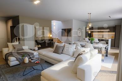 Inserita in un contesto privato, l'abitazione si sviluppa su due livelli ed è circondata da un ampio giardino esclusivo di 167 mq, fruibile attraverso una grande vetrata scorrevole che valorizza la luminosità e crea continuità tra gli spazi interni ed esterni.